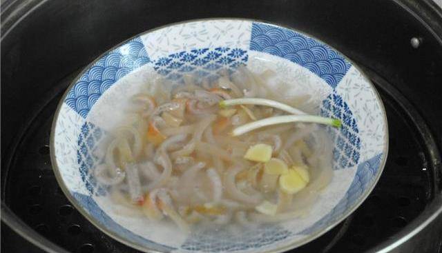 放入碗中,加入少許鹽,蔥白和薑片,加入三倍的清水,上蒸鍋蒸20分鐘,將肉皮蒸軟。