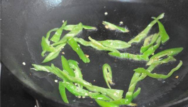 鍋裡放油,加熱後倒入青椒片炒至微微變軟。