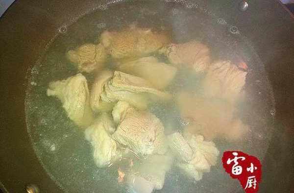 2、鍋裡加水燒開之後,加入羊肉焯水,煮出浮沫後將羊肉撈出洗幹凈。