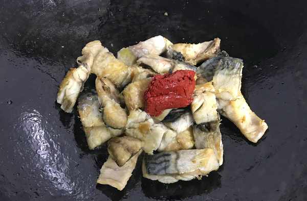 6、把煎好的青花魚放入鍋中,加入1勺紅酒糟,和少許鹽,加小半碗水。