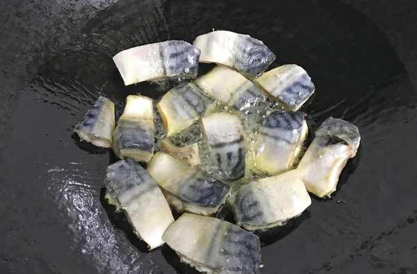 4、鍋中熱鍋熱油,放入青花魚,煎至表面微黃,盛出。