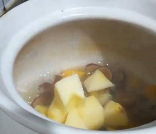 3、準備一個合適的煲湯砂鍋,接著在砂鍋中先放入紅棗塊和紅薯塊,再倒入足夠的清水,然後蓋上蓋子用大火燒開轉成小火將紅薯煮制熟透。