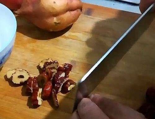 1、首先我們把紅棗洗幹凈,然後去掉裡面的棗核再切成薄塊備用。