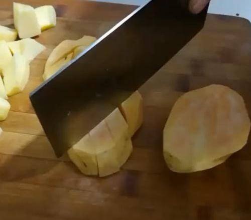 2、把紅薯和蘋果都分別去掉外面的一層皮,然後清洗幹凈再切成滾刀塊備用。