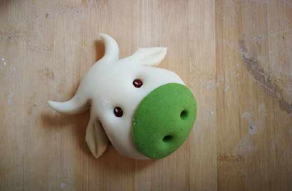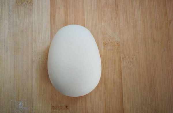 4,然後搓成一頭稍細的,橢圓體面團,細的那頭,做牛的頂部。寬的那頭,做嘴巴。
