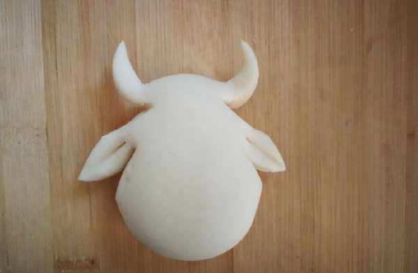5,在用剪刀,剪出小牛花樣饅頭的耳朵,和牛角,然後用牙簽壓一耳朵,牛角往上折一下。