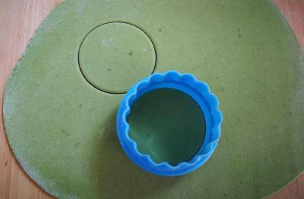 6,取一點白面團,然後加適量的抹茶粉,揉勻,搟成面皮,用圓形模具壓出面皮,或者碗口扣出圓形面皮。