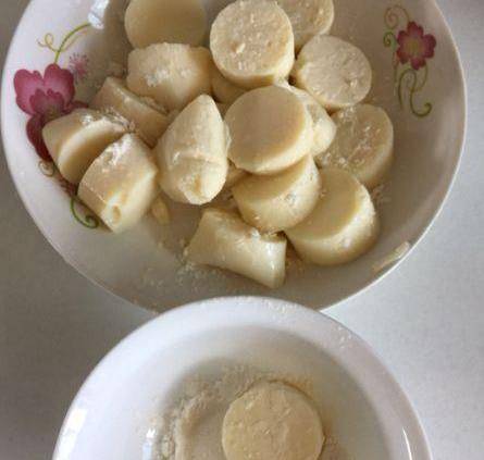 切好的日本豆腐裝盤,用一個小碗裝面粉,將日本豆腐均勻裹上面粉,一個個裹均勻。(日本豆腐很容易碎,炸之前一定要裹上面粉)