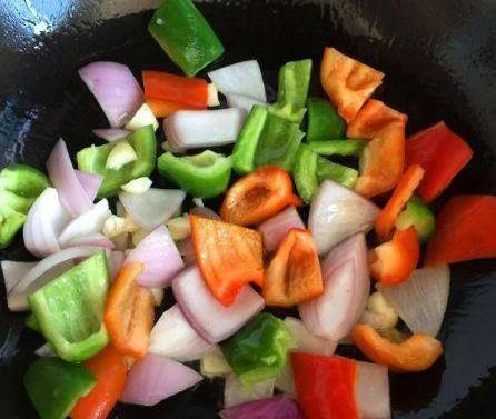 鍋洗幹凈,熱鍋倒油,油燒熱瞭,放大蒜末下去煸炒。將切好的紅菜椒、青菜椒、洋蔥倒入鍋裡翻炒片刻。