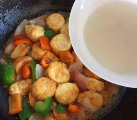 再將炸好的日本豆腐倒入鍋裡一起翻炒。(翻動時要小心不要用鏟子把豆腐弄破)