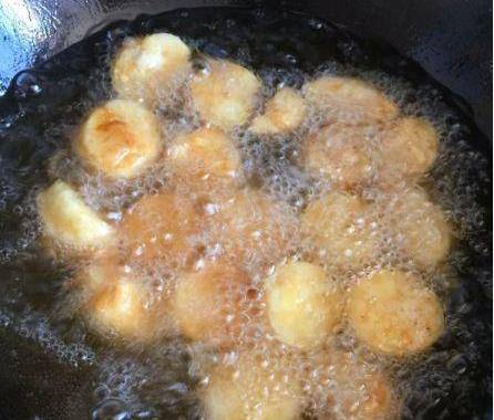 鍋裡燒油,油燒到4-5層熱,將裹好面粉的日本豆腐一個個放入油鍋裡炸。用小火或中火慢慢炸,不要一直去翻,非常容易碎,炸到日本豆腐成微黃色,即可撈出。