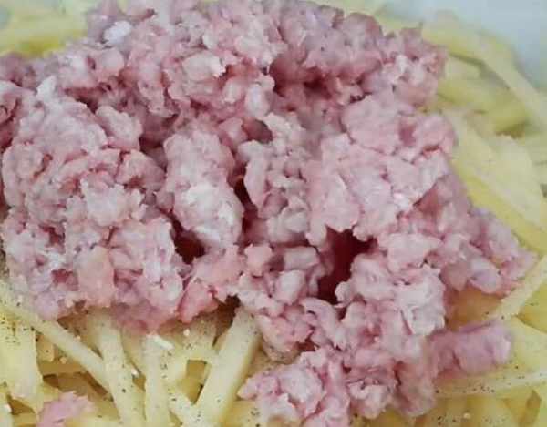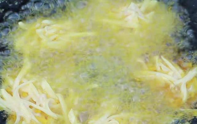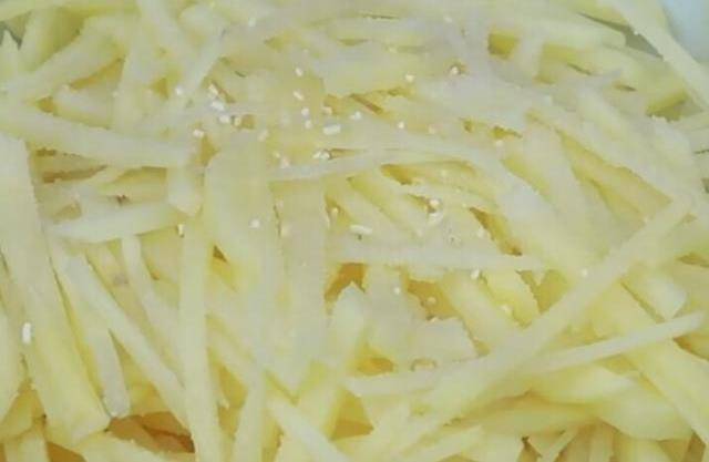 ①、土豆3個(削皮,洗凈,切成細絲,再倒入清水中,洗去淀粉,再濾幹水分備用)。