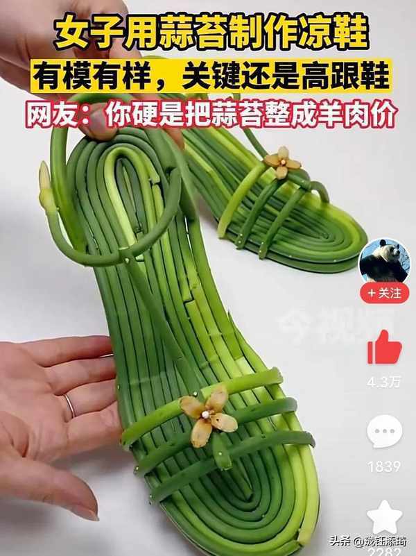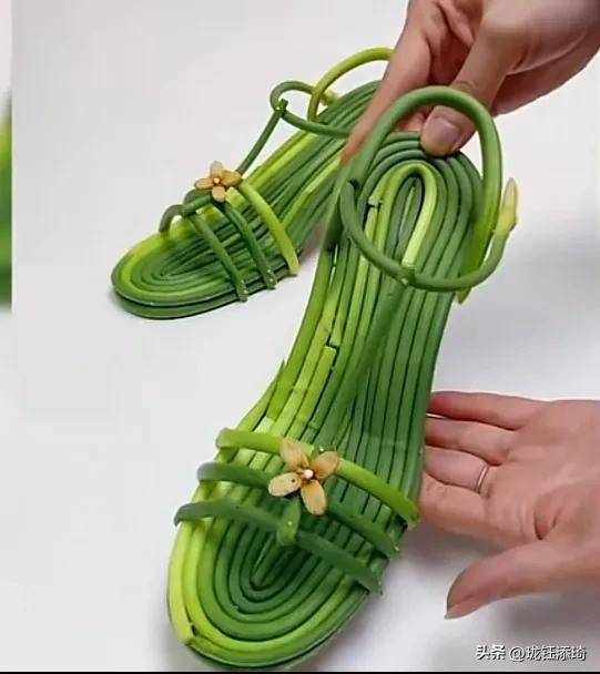 也不得不說,這位女子真的是腦洞大開啊,誰能想到這蒜薹制作成涼鞋後會這麼的漂亮呢?