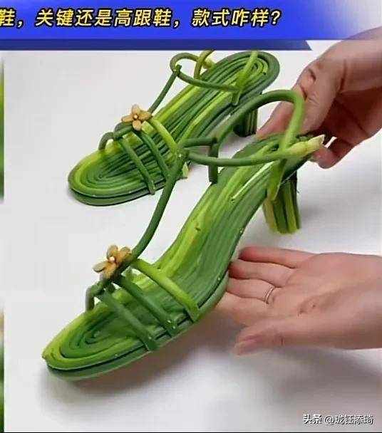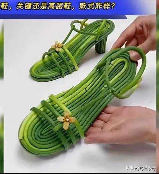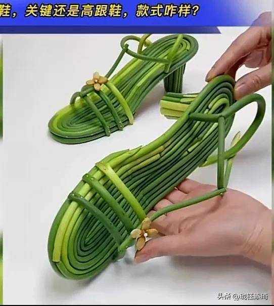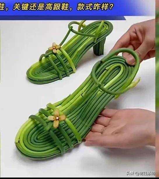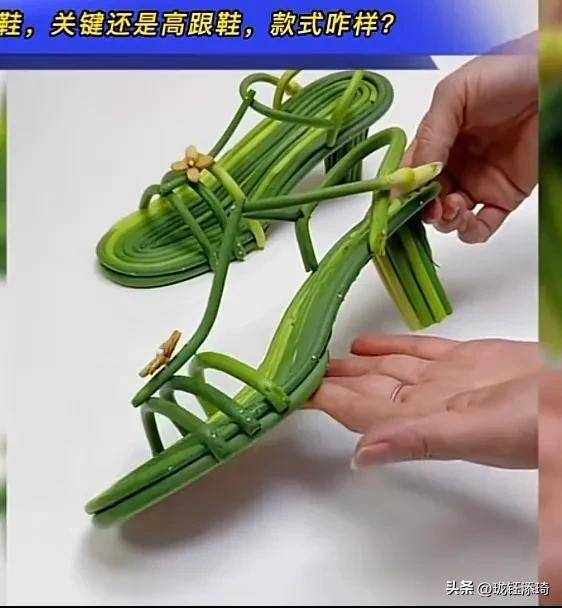 而這位女子把蒜薹制作成涼鞋之後,看上去就是一雙像翡翠一樣碧綠碧綠的,女士高跟涼鞋啊!