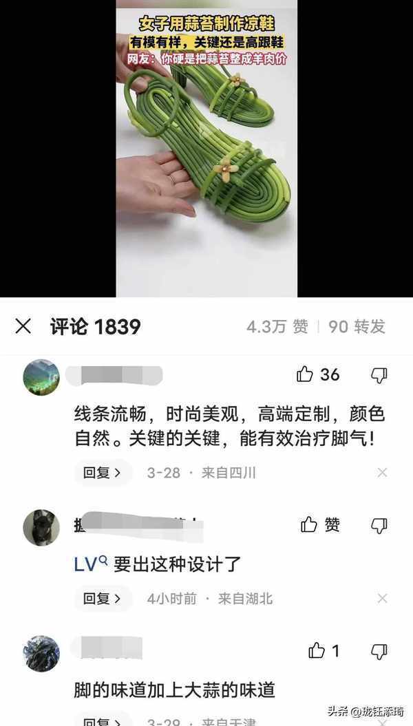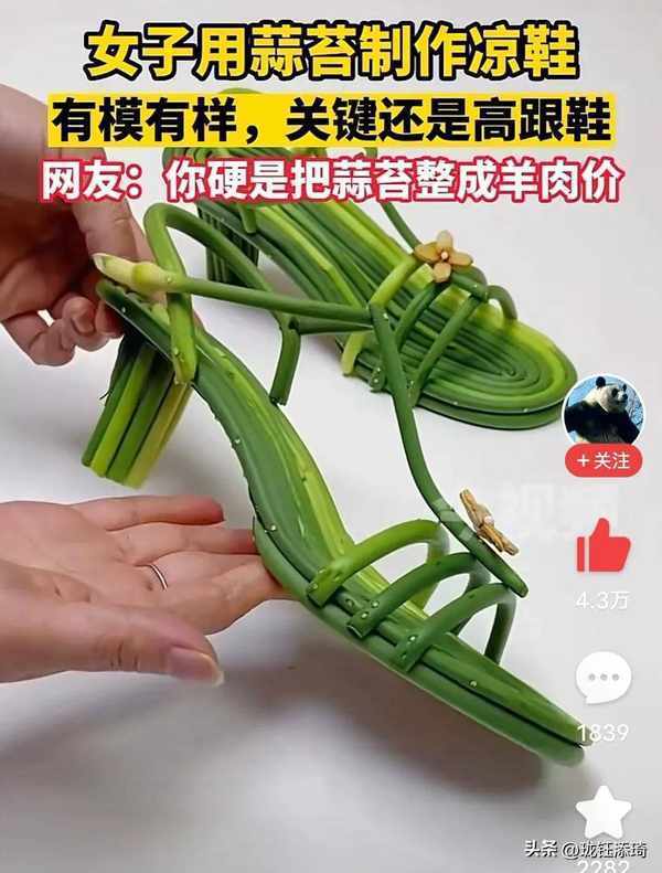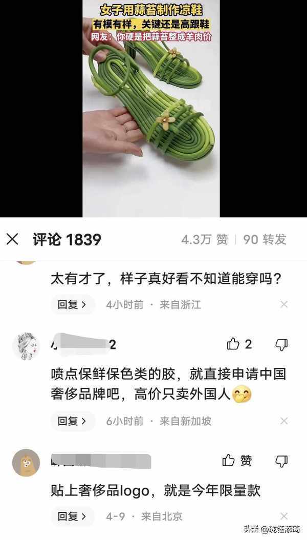 還有網友表示,這樣一來那麼蒜薹都要漲價瞭。當然也有網友表示想買這樣的涼鞋,畢竟這樣的涼鞋雖然不能實際穿著下地,但是看著養眼啊,翠綠翠綠的,這雙涼鞋多漂亮啊!你們覺得呢