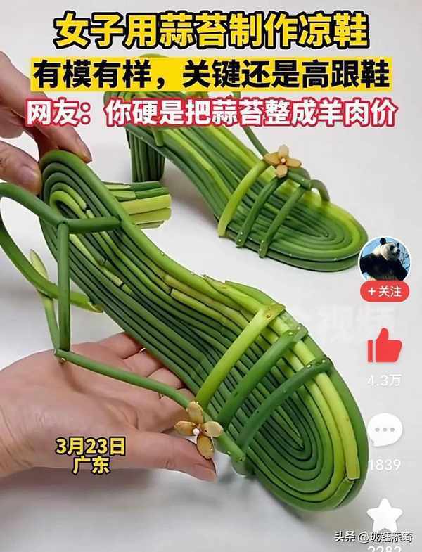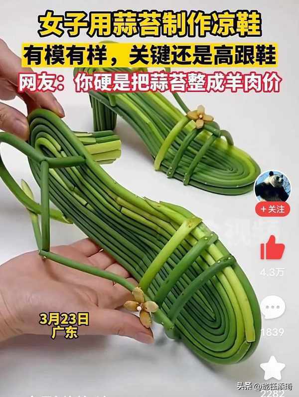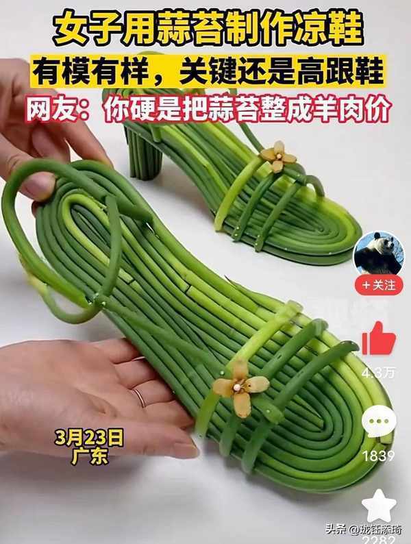 廣東一女子,突發奇想用蒜薹制作瞭一雙涼鞋,並且還是高跟鞋,不得不說真的是很精美!
