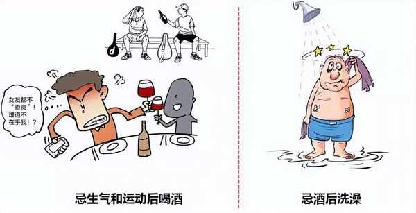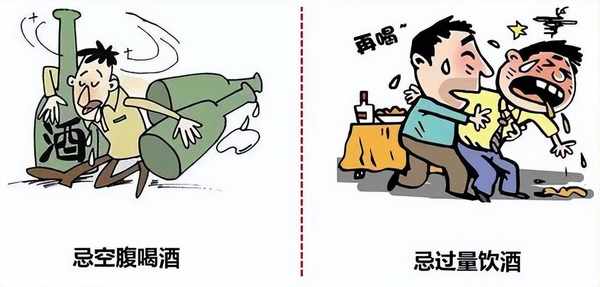 空腹飲酒,特別是高濃度的酒,對口腔、食道、胃、肝臟都有很大的傷害。實驗表明,空腹開懷暢飲隻要達30分鐘,酒精對機體的毒性反應便能達到高峰。埋頭喝悶酒或飲賭氣酒都容易使人醉倒。所以在飲酒前先吃點食品,高蛋白和含維生素多的食物為佳,使體內分解酒精的酶活力增強,就能在一定程度上起到保護肝臟的作用。但是飲酒時,不宜吃太咸的食物。空腹飲酒時,肝臟很快將酒精吸收,進而抑制瞭肝糖原的分解和糖原異生,容易導致低血糖癥的發生。