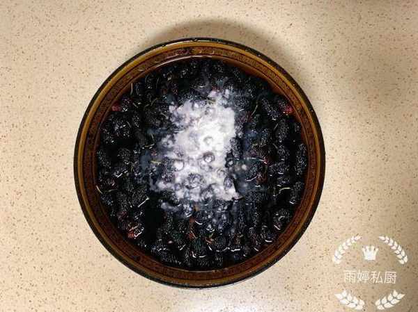 然後把桑葚放在大碗中,加入沒過食材的水,舀上一勺面粉拌勻,讓附著在桑葚上的雜質臟東西隨著面粉的吸附清洗幹凈。