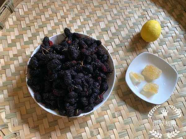 清洗幹凈的桑葚備用,準備三兩塊老冰糖,一個檸檬備用。