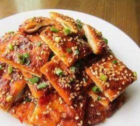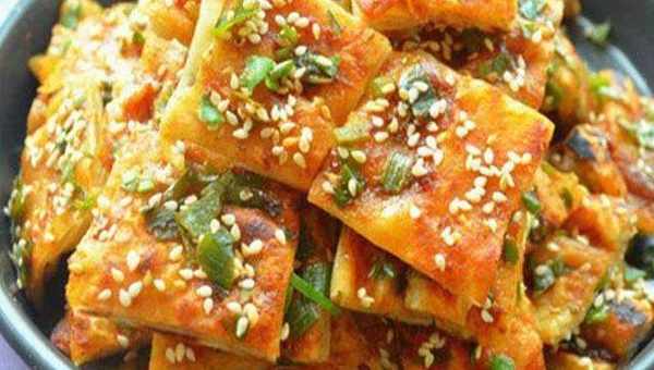 8.均勻抹上醬料,撒上蔥花和熟芝麻,再稍稍煎一下即可盛出切片。