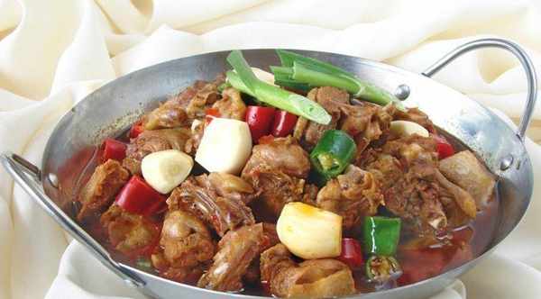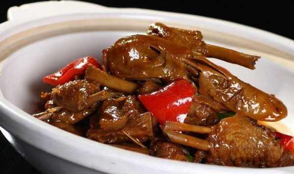 4.開油鍋,將油熟至 時將第二條準備的東西倒入油鍋炒5分鐘,出香味時將鴨子倒入一起翻炒,肉成白色即可。