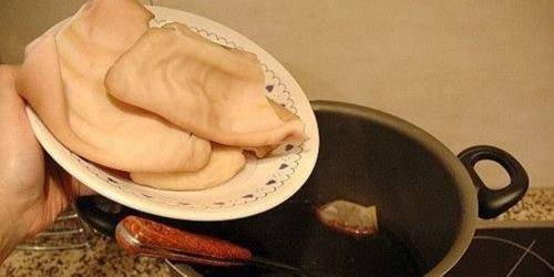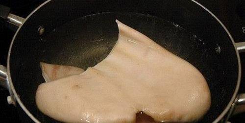 第三步:燒一鍋熱水,將豬耳朵簡單焯一下,時間不用長,變成白色即可撈出備用。