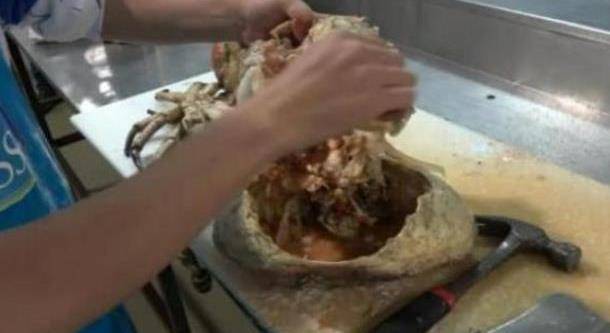 誰知道等到小哥哥把這隻螃蟹蒸熟之後拿出來吃,沒想到結果就悲劇瞭,因為這隻大螃蟹掰開之後,蟹殼裡頭竟然是空的,一口肉也沒有魚是無奈的,小哥哥隻能去吃蟹腿裡邊的肉,卻發現蟹腿裡頭的肉也是少的可憐。這個螃蟹殼別看特別大,可是裡邊竟然根本就沒有螃蟹肉,隻剩下蒸螃蟹留的很多湯汁瞭,就連蟹肉裡頭的肉也是小小的一塊兒,雖然說螃蟹鉗子很大,用剪刀把它剪開之後發現,裡邊也隻剩瞭一些湯汁,隻附帶瞭很少的肉丁。