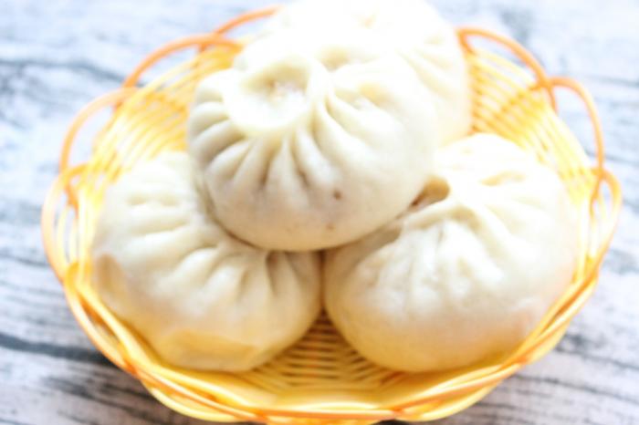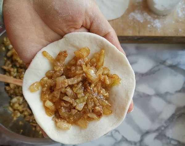 第五步:拿一個包子皮,放上餡料,餡料的多少可以隨意。