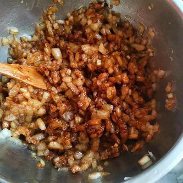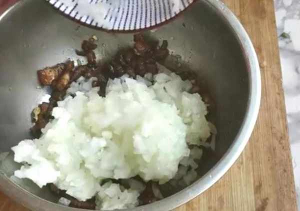 第二步:五花肉丁放到鍋裏煸香,加入葱末薑末鹽,然後烹一勺醬油炒勻倒出。冬瓜去皮,切成小丁,加少許鹽去掉多餘的水分,用手捏去水,放入到肉餡中。