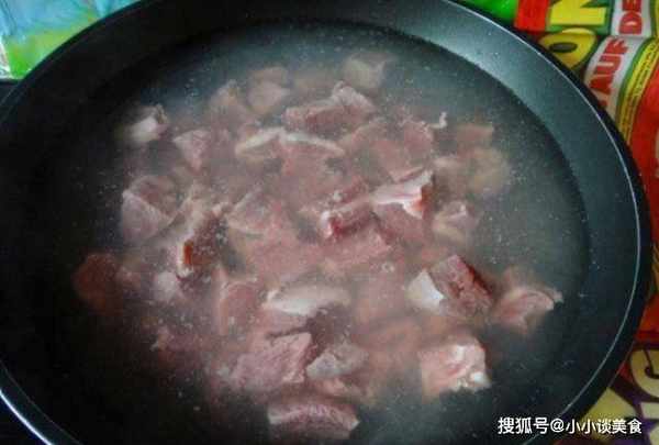 第一步:先將買來的牛肉洗凈,切成小塊,然後燒一鍋水,水熱後將牛肉放入鍋中焯一下,焯去血水,撈出瀝幹。在牛肉瀝幹的同時,加工牛肉所需的原料。