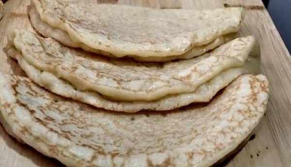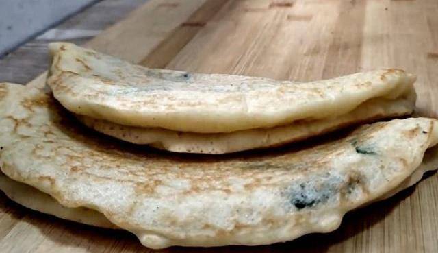 第三步:在平底鍋裡刷一層油,倒上一勺面糊快速攤平,大約烙1分鐘就可以出鍋瞭,因為餅很薄,稍微一烙就熟瞭,不用烙的兩面金黃,如果烙的兩面金黃,餅吃起來口感就不暄軟瞭。
