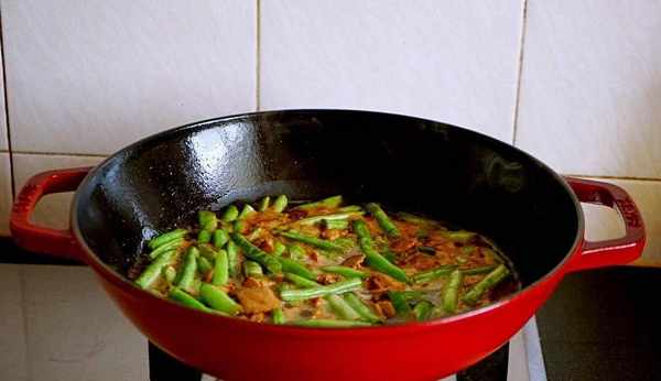 準備好這些以後,我們準備一口鍋,在鍋裡面加入適量的食用油,等到油燒熱以後,我們把薑片,蒜末和八角放在鍋中炒出香味,然後把準備好的五花肉也放在鍋中炒至發白,最後再加上一勺老抽上色。然後把豆角放在鍋中翻炒均勻,等到翻炒均勻以後,加入適量的生抽老抽,食用鹽,白糖,充分的翻炒均勻,翻炒均勻以後炒上幾分鐘,然後加入一些水,等到水燒開以後把火轉成小火,然後把準備好的湯汁盛出來一部分蓋上蓋子燜煮上15分鐘左右的時間。