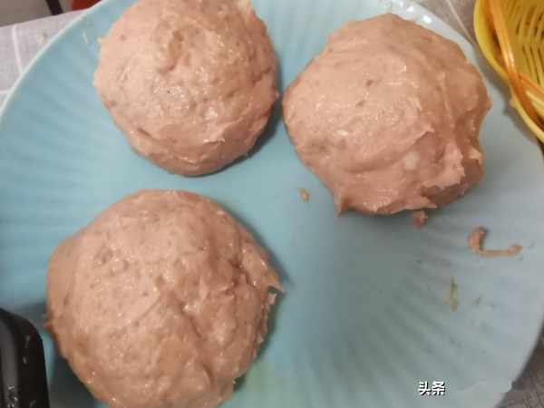 第三步:手上抹油防止粘連,把攪好的肉泥,團成大個的圓子。