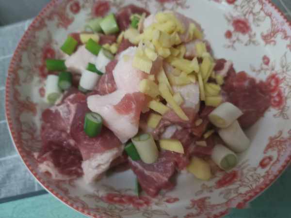 第一步:五花肉加入葱,薑,用破壁機打成肉泥,打得細膩一些。