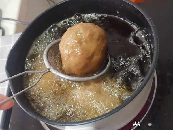 第四步:鍋裏放入適量的花生油,把丸子放入炸制金黃撈出。這樣的圓子一次可以多做一些,速凍隨吃隨取很方便。