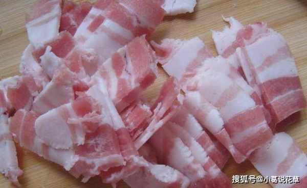 2.準備一塊五花肉。五花肉清洗幹凈,切成片。將蔥洗凈,切成片。將生薑洗凈,切成片。大蒜去皮切成蒜末(蒸魚用一塊五花肉,這樣蒸出來的魚肉質會更細膩)。