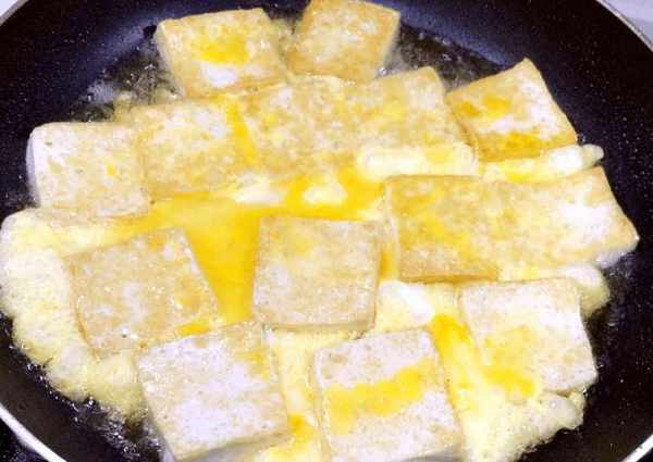 豆腐盛滿後,鍋中加入少許食用油,然後加入蒜瓣、蔥末、八角和胡椒粉。烤出香味後,將炸好的豆腐放入鍋中,一邊不停地攪拌,一邊炸得均勻,讓豆腐更香。不過在炒的過程中,力道要盡量小,避免鏟起,速度要快,然後加入醬油和鹽,炒勻,將混合好的蛋液倒入鍋中,均勻抹在豆腐上。等雞蛋凝固後再翻豆腐。
