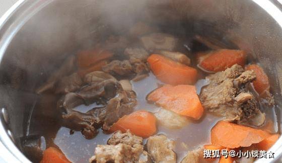 4、羊肉熟前40分鐘,將胡蘿卜下鍋。待胡蘿卜燉至軟爛時,加入適量鹽調味,再煮一分鐘至出鍋即可。