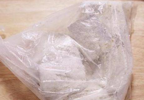 第三步是放在一邊醃制,這個大概需要半個小時。這個過程中準備一小碗面粉和一個保鮮袋,將面粉放入保鮮袋中,然後將醃好的魷魚放入其中;