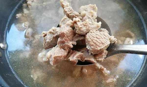 3、鍋內放適量水,將牛肉放入鍋中過冷水,大火燒開水焯一下,然後用勺子撇去上面的浮沫,撈出牛肉洗凈.