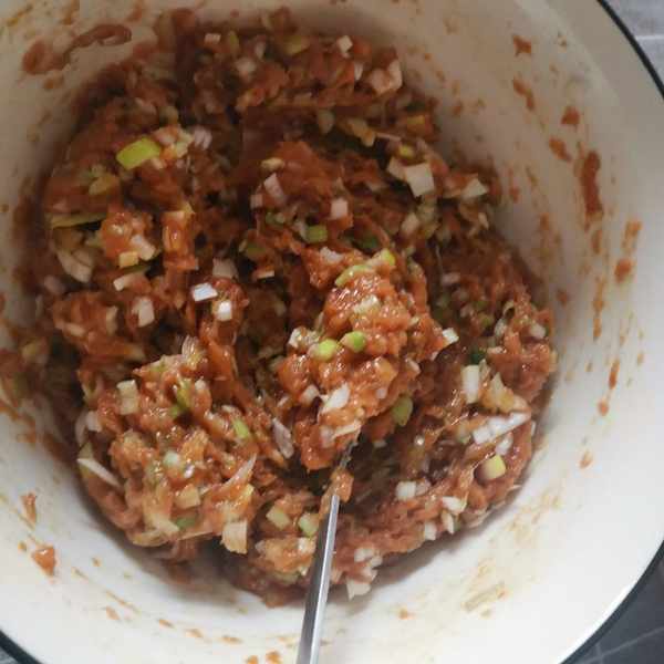 第四步:把切好的大葱放入肉餡中攪拌均勻即可。