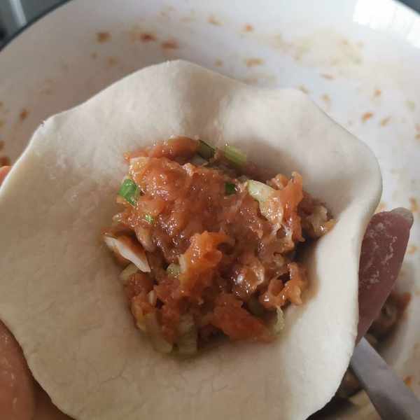 第六步:包子皮中放入適量的餡料。肉餡包子不建議放太多的餡料,適當即可,肉餡太多吃起來會膩。