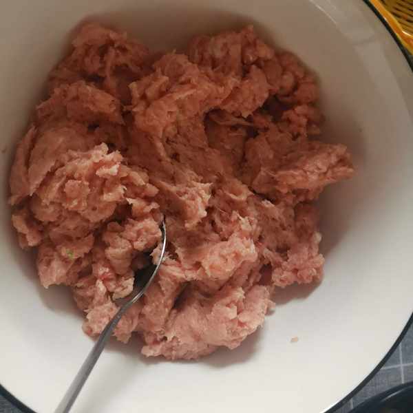 第二步:猪肉用料理機打成細膩的肉餡,放入少許清水攪打均勻,加入醬油,薑末和鹽調味,最後加入花生油鎖住水分。