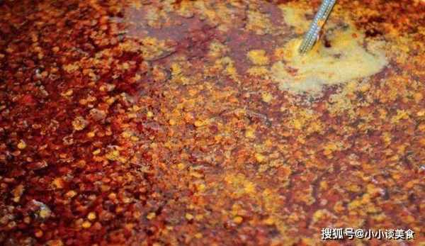首先,我們在燒油的時候,要在油裡放一些大料,還有蔥、薑、蒜。小火慢慢烤出香味後,將這些香料取出,保留大料的成分。辣椒油會很香。炸好後,我們在油裡放幾顆冰糖,然後用勺子慢慢攪拌,直到冰糖全部融化。