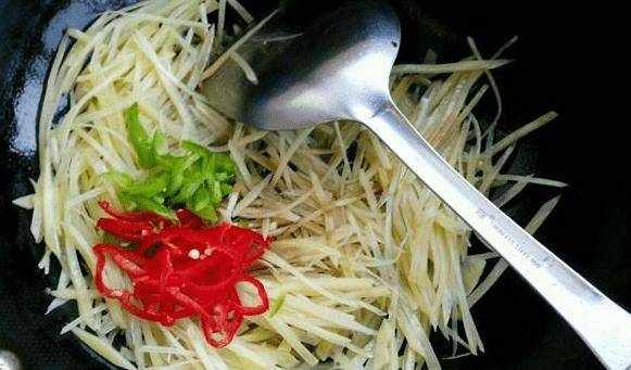 3.將油倒入鍋中。油熱後,加入幹辣椒和大蒜,炒香。然後倒入瀝幹的土豆泥翻炒。約30秒後,加入適量白醋和鹽調味。攪拌均勻後,撒上蔥花,翻炒幾下即可出鍋。