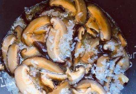 第三步,電飯鍋內鍋裡的食用油比平時多加一點。燒熱後放入蔥薑末翻炒出香味,然後將蝦米和香菇一起放入鍋中;