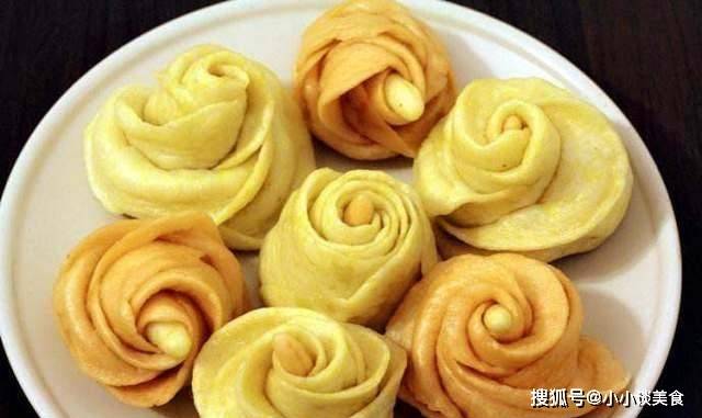將所有材料揉成光滑的面團,靜置15分鐘。將面團切成每塊10克的小塊。.搟成圓形,盡量搟薄一些,搟出來的花紋會很漂亮。每六塊從上到下排列。用筷子在中間用力壓住,把面條壓緊,方便從下往上搟卷。卷的不要太緊,交配後會開出花型。用刀從中間切開,整形。放蒸汽醒一個小時左右,室溫16度左右。水開後轉中火蒸15分鐘,關火再煮5分鐘,開蓋。