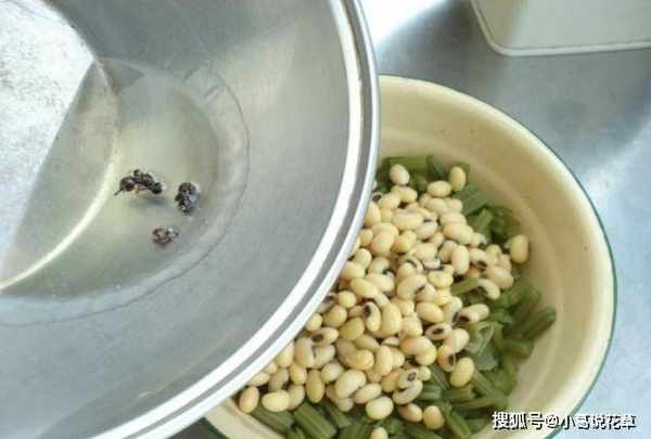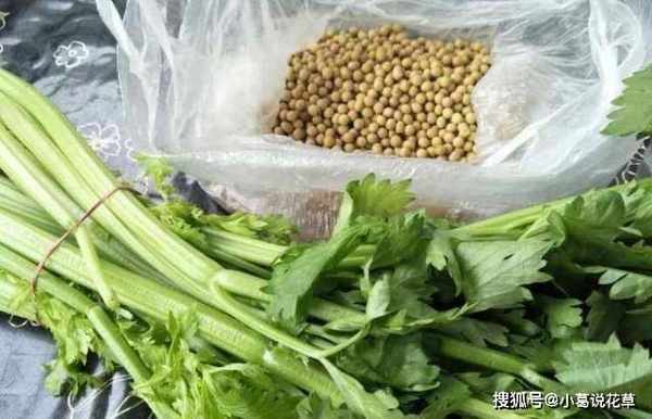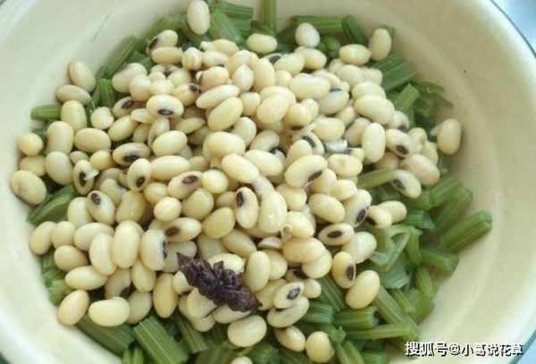 第二步:胡芹焯水後撈出,瀝幹水分。瀝幹水分後,將胡芹切段備用。然後找一個碗,把黃豆放在碗裡,加水沒過黃豆,水滿瞭黃豆會更好吃。這一步最好在前一天晚上做,因為泡黃豆需要很長時間,所以不能浪費時間。