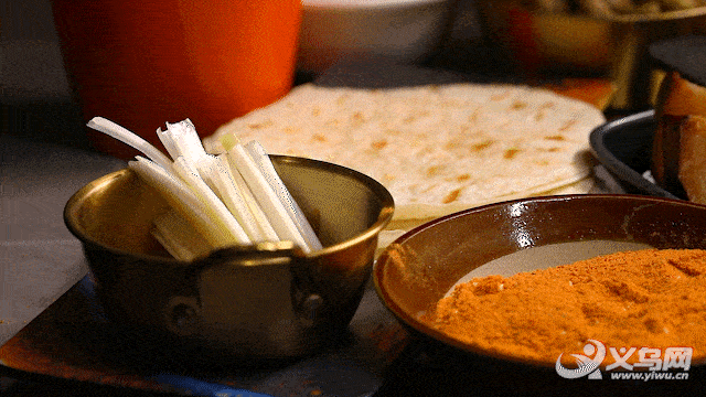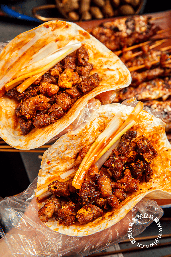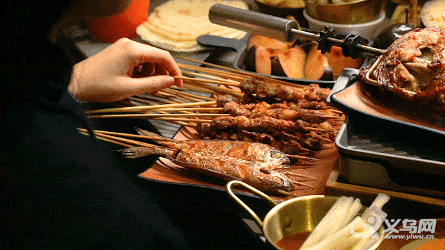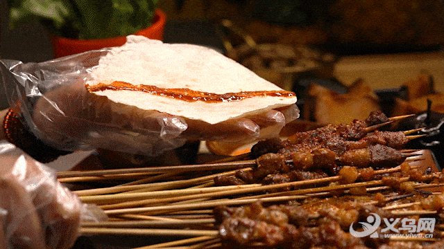 沒搶到淄博的機票也沒事~在義烏也能吃上淄博小餅卷燒烤瞭,淄博小餅折疊,蘸上每種燒烤料,夾入小蔥和肉串,再推薦加入他傢的手串牛油,味道讓你不枉此行!