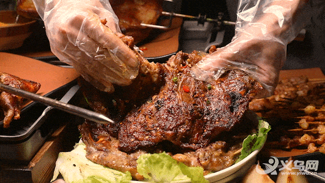 為方便食用,目前烤羊腿已改為切塊上桌,先爐烤再炭烤,一隻羊腿也能吃到多種風味,越嚼越幹香,再沾上孜然辣椒面想喊停都難!
